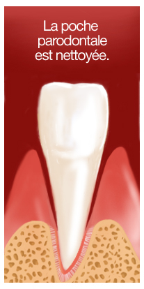Les importantes quantités de bactéries et de tartre qui se sont accumulées sous la gencive sont retirées après anesthésie. Le nombre de séances proposé peut varier en fonction de la gravité de la parodontite et du nombre de dents atteintes. Pour parfaire la désinfection sous-gingivale, le surfaçage peut être suivi d’une irrigation des poches parodontales à l’aide d’antiseptiques.