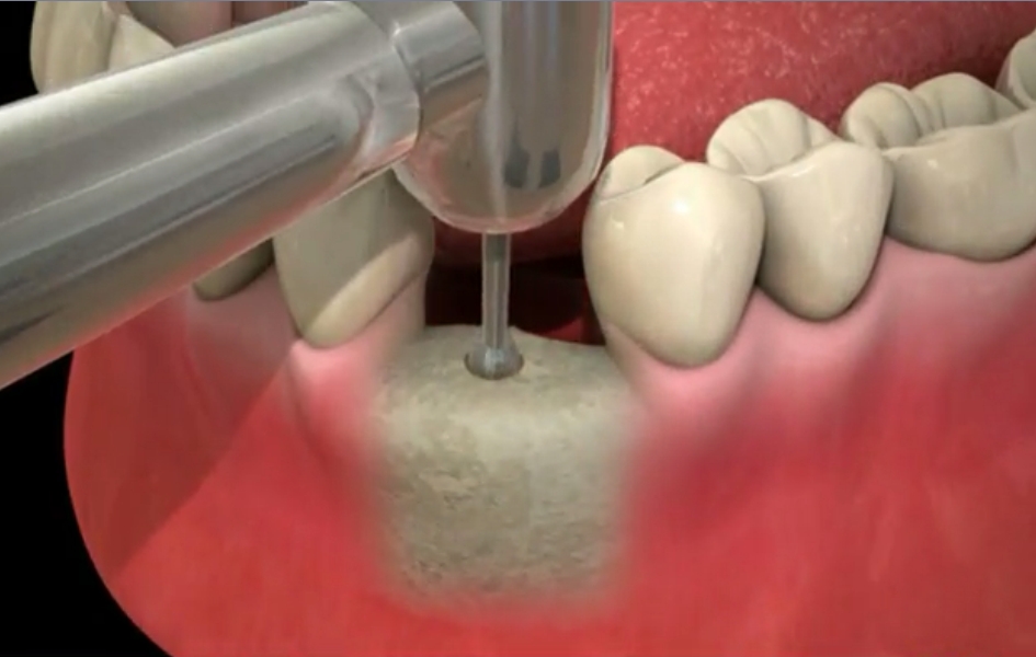 Une anesthésie locale est réalisée. La gencive est incisée et dégagée pour avoir accès au site osseux où la pose de l’implant est prévue. Le passage successif de forets de différents diamètres permet de préparer le logement dans lequel l’implant est ensuite mis en place.